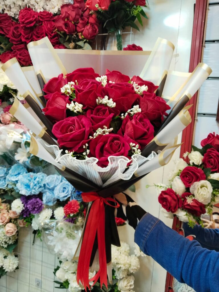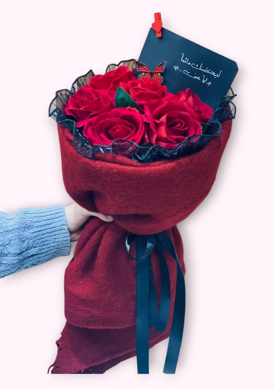 “الأحمر مش مجرد لون… إنه إحساس وشعور! مع بوكيه الشال الأحمر، كل مناسبة تصبح لحظة لا تُنسى، مليئة بالأناقة والجمال والرومانسية.”